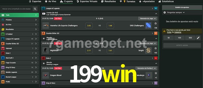 O 199win oferece uma grande seleção de opções de apostas em e-sports com probabilidades competitivas